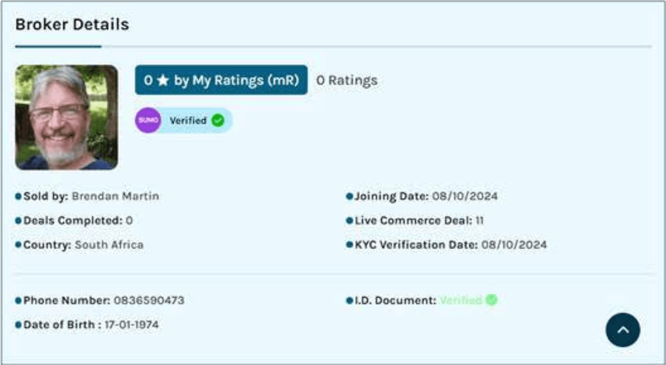 Every broker on Sumo has a verified profile with ID, KYC documentation, and transparent ratings from previous buyers and sellers.